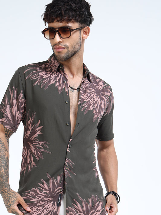 Elevate your casual style with the Olive & Mauve Floral Burst Short-Sleeve Casual Shirt. Featuring...