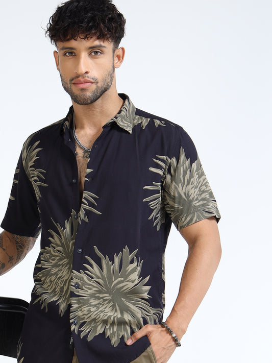 Elevate your casual wardrobe with the Navy & Olive Floral Burst Short-Sleeve Casual Shirt. Featuring...