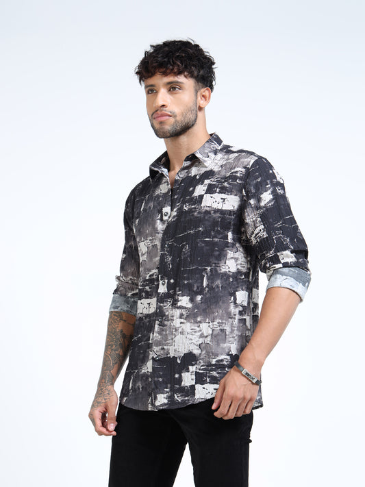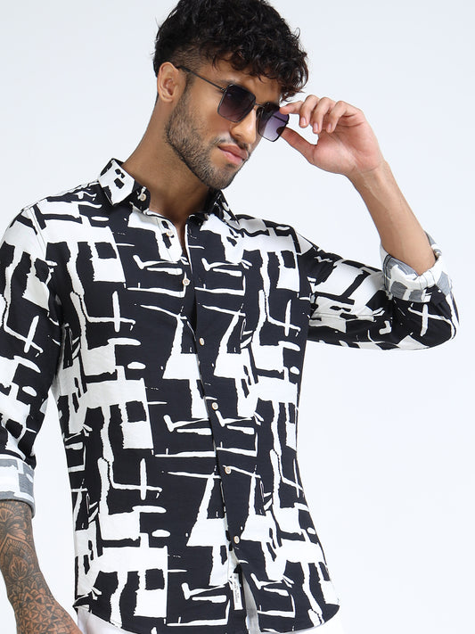 Elevate your wardrobe with the Black & White Geometric Brush Print Full Sleeve Shirt—a bold...