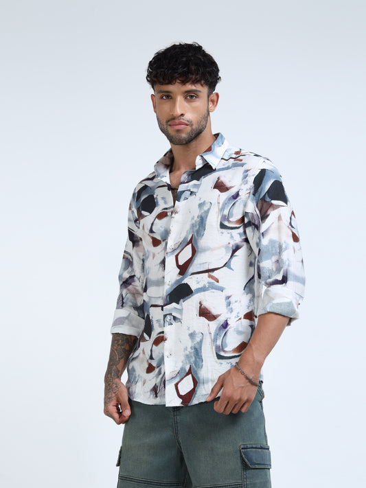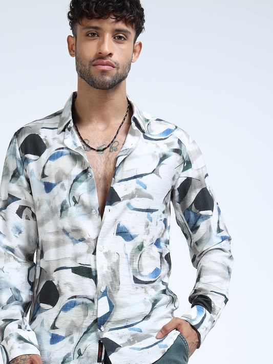 Step into statement styling with the White & Blue Abstract Brushstroke Full Sleeve Casual Shirt...