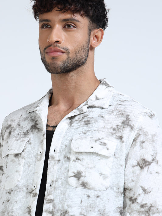 Effortlessly cool and confidently laid-back—this White & Grey Tie-Dye Print Textured Overshirt brings rugged street...
