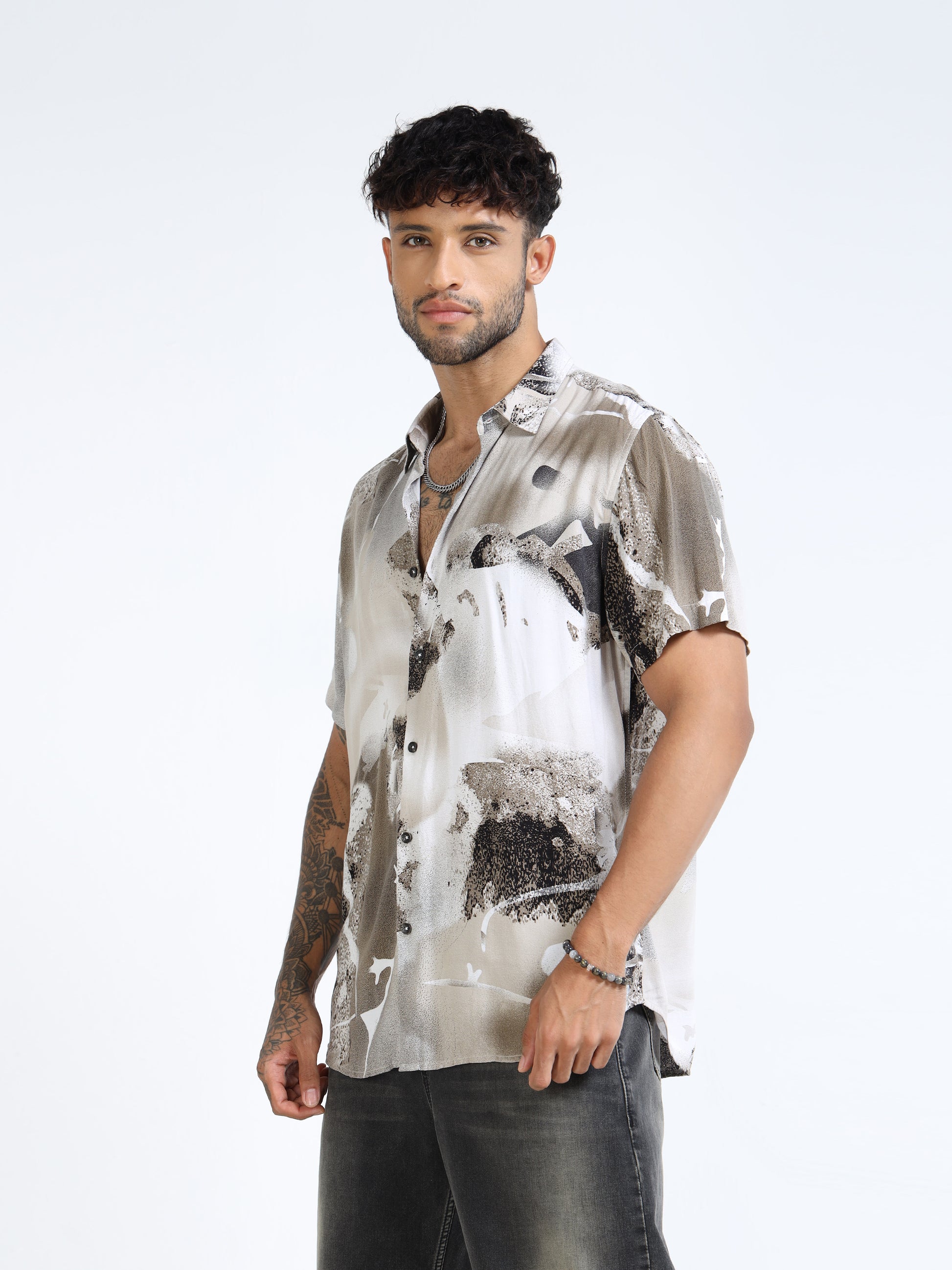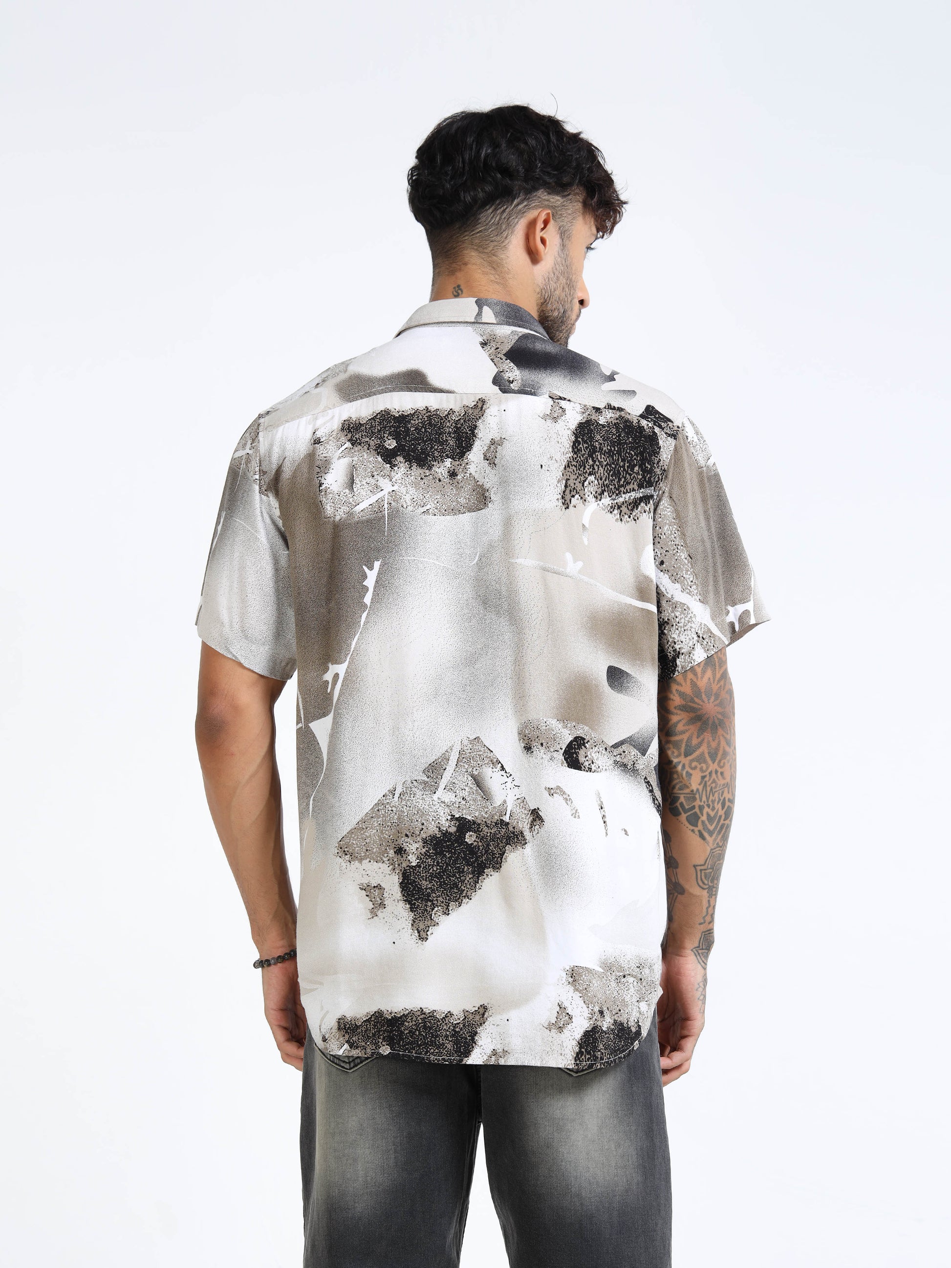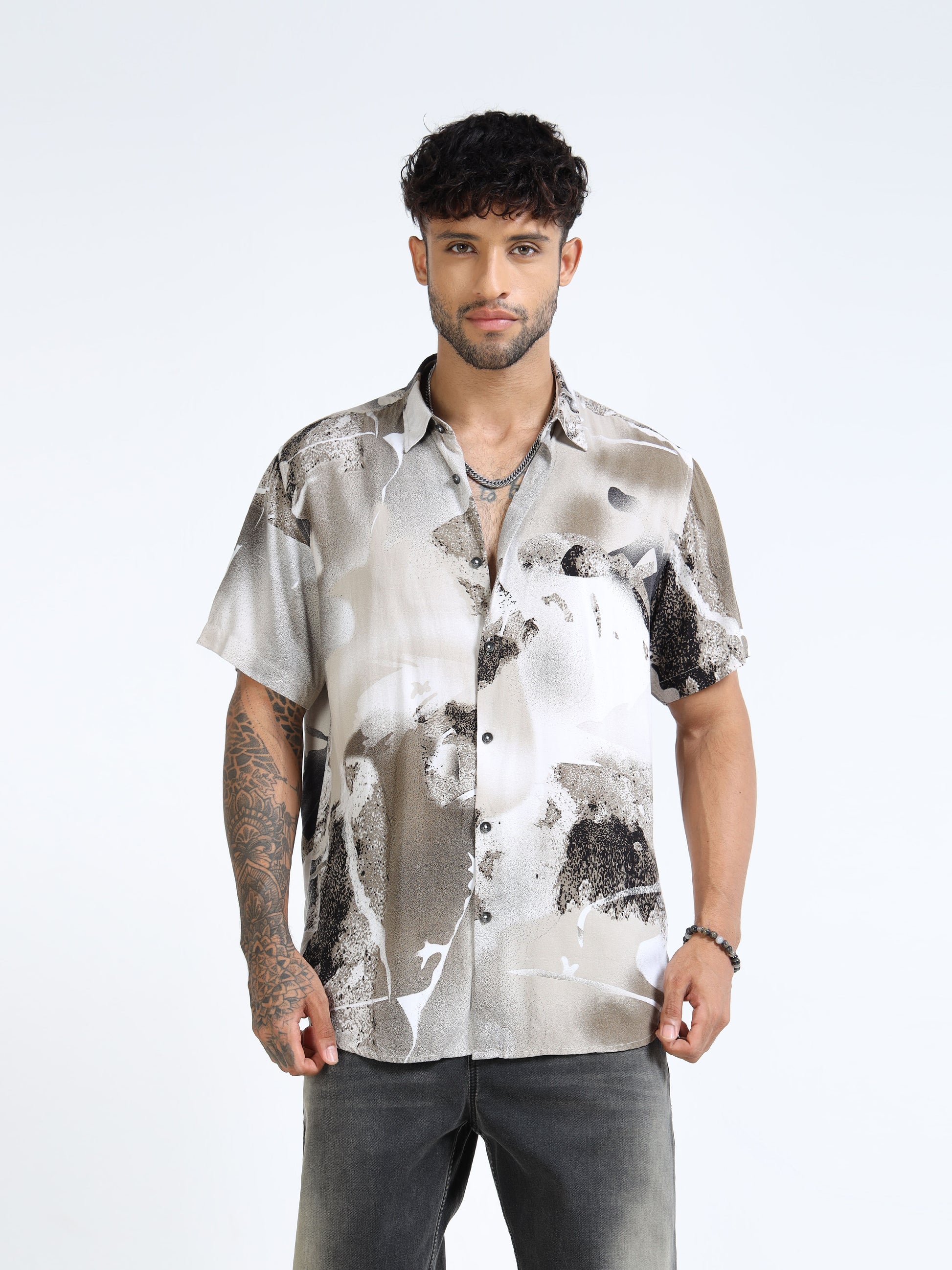 Elevate your warm-weather wardrobe with the Beige & Charcoal Abstract Splash Half Sleeve Casual Shirt. Featuring a captivating abstract wash of beige, charcoal and soft white tones, this shirt delivers an artistic statement while keeping the vibe effortlessly relaxed. With its short sleeves, classic collar and button-down front, it’s made to move seamlessly from casual day plans to evening get-togethers.