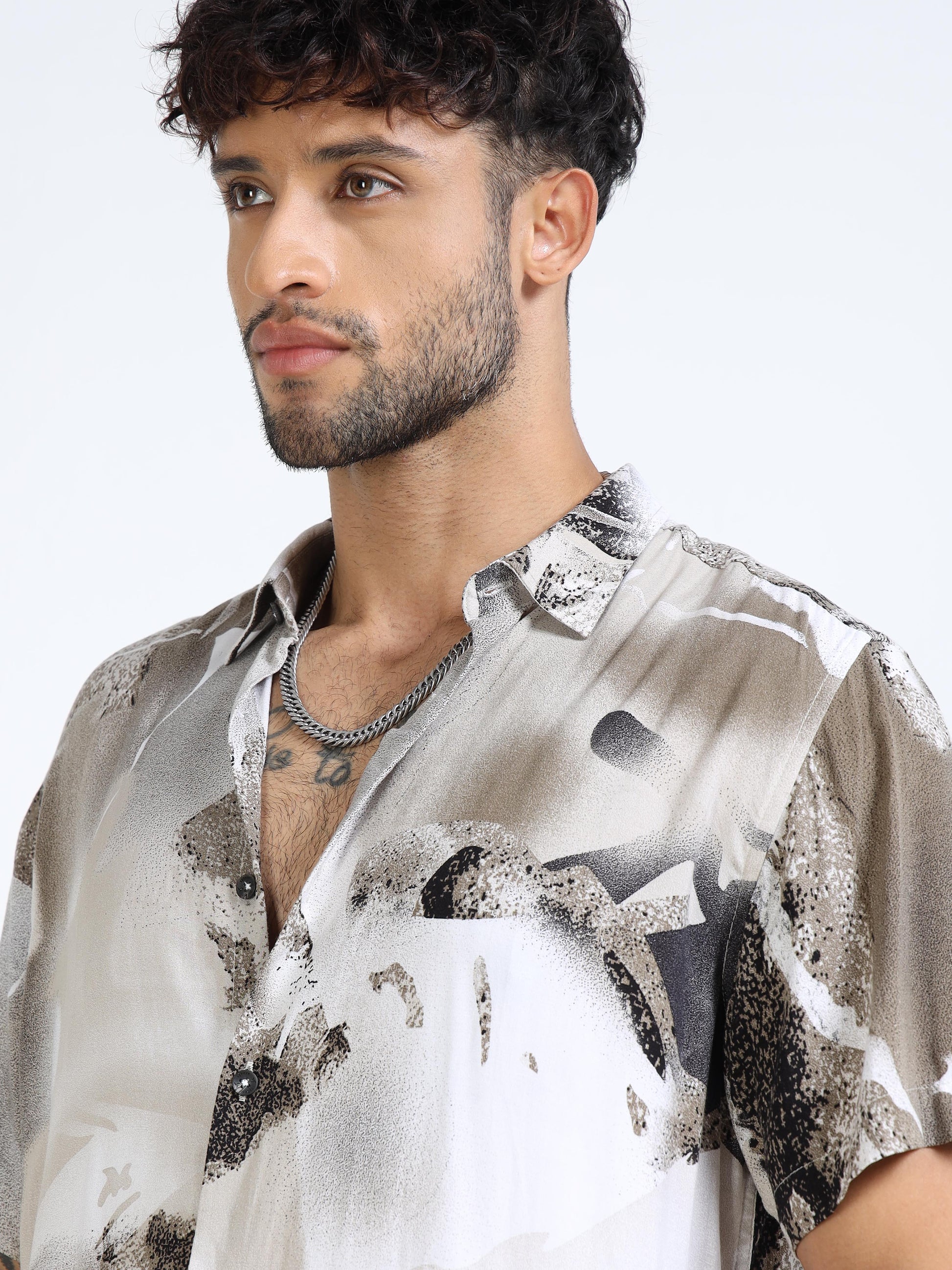 Artistic beige and charcoal abstract splash print gives the shirt a modern, expressive edge.