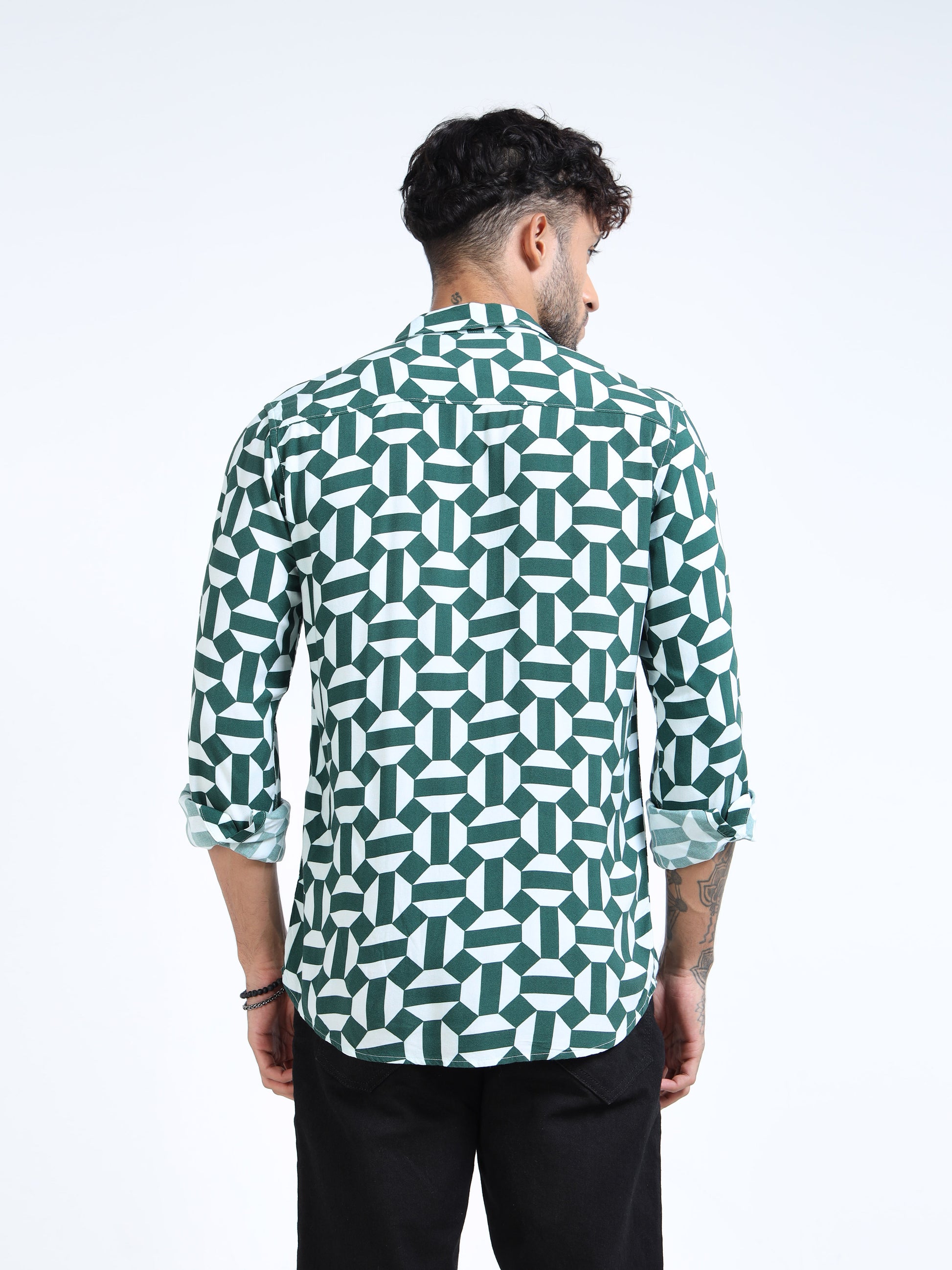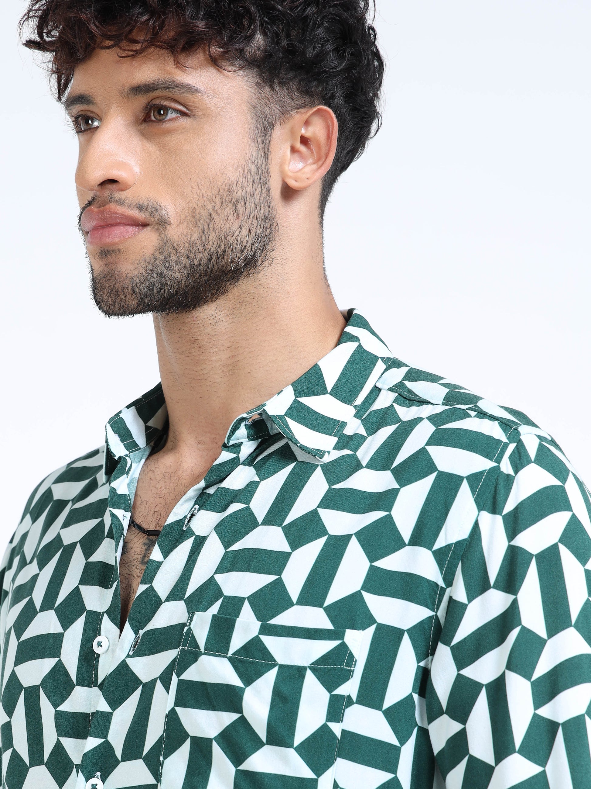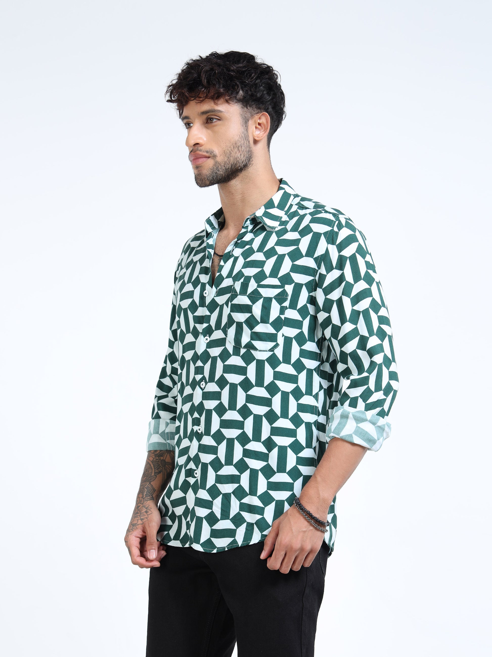 Elevate your wardrobe with this Green Geometric Print Full Sleeve Casual Shirt. Featuring a bold geometric pattern in rich green and white tones, this full‐sleeve shirt blends contemporary flair with casual ease. It comes with a classic collar, button‐down front, chest pocket and a curved hem — perfect for turning heads while staying comfortable.