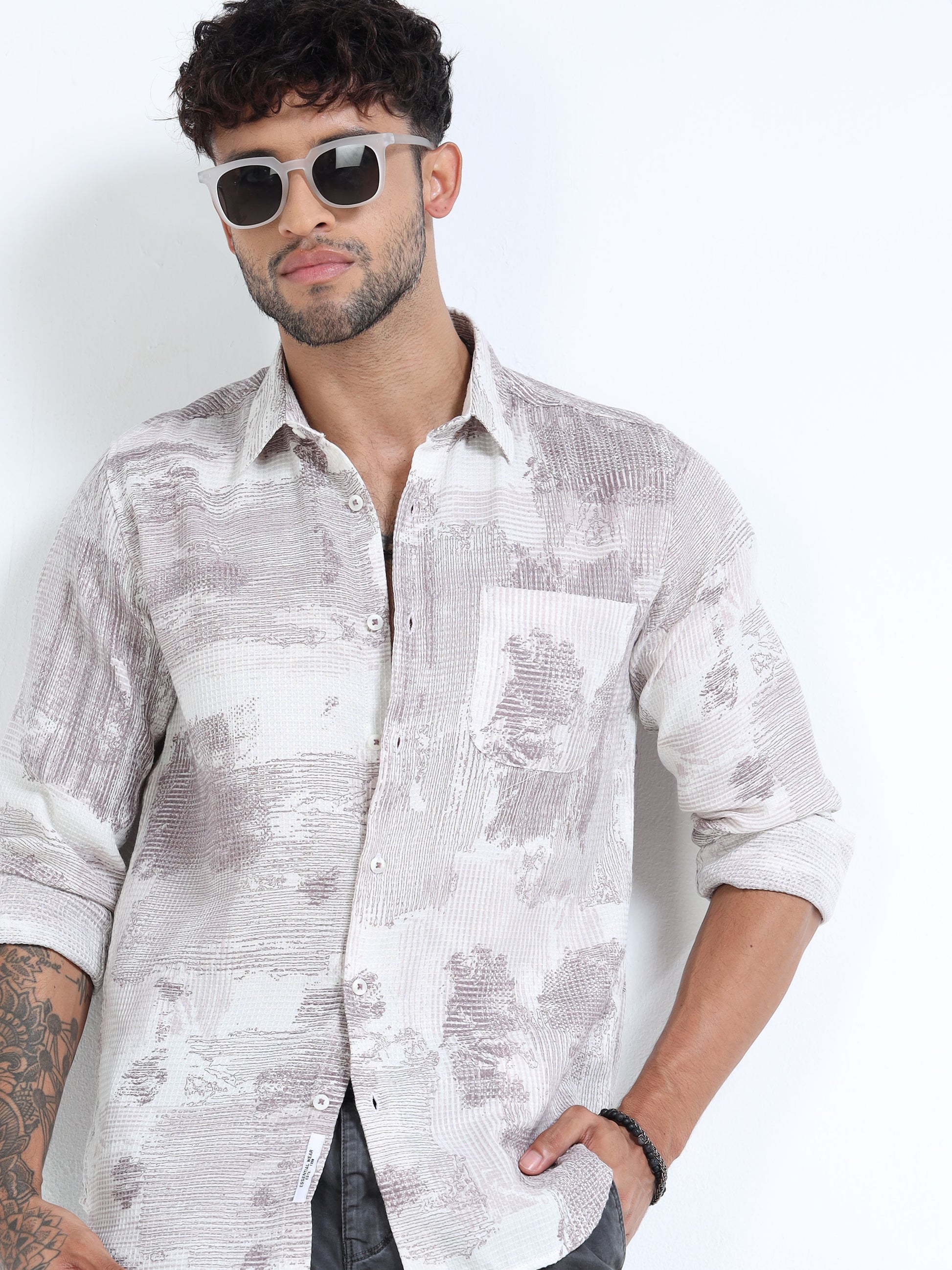 White & Mauve Brushstroke Textured Long-Sleeve Casual Shirt